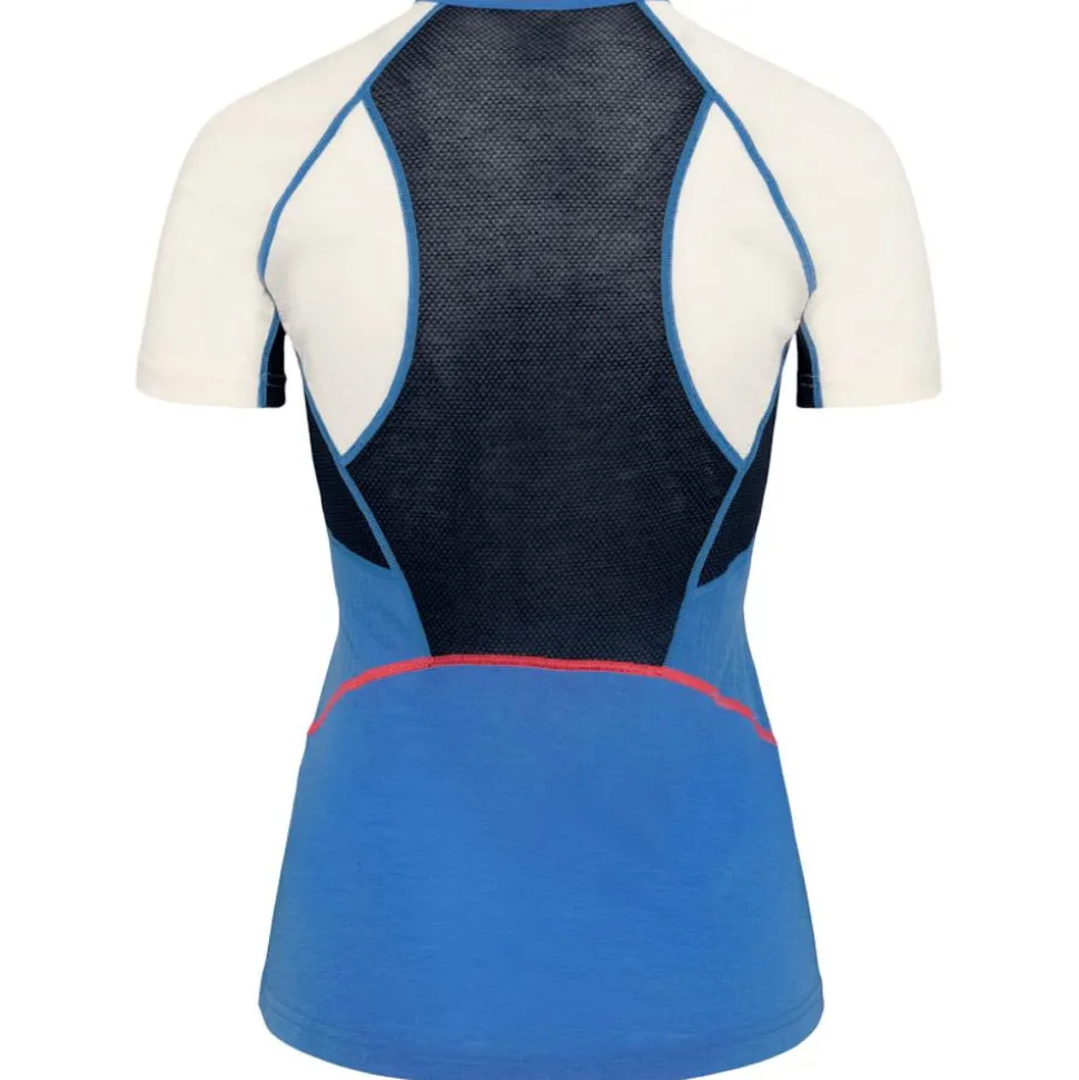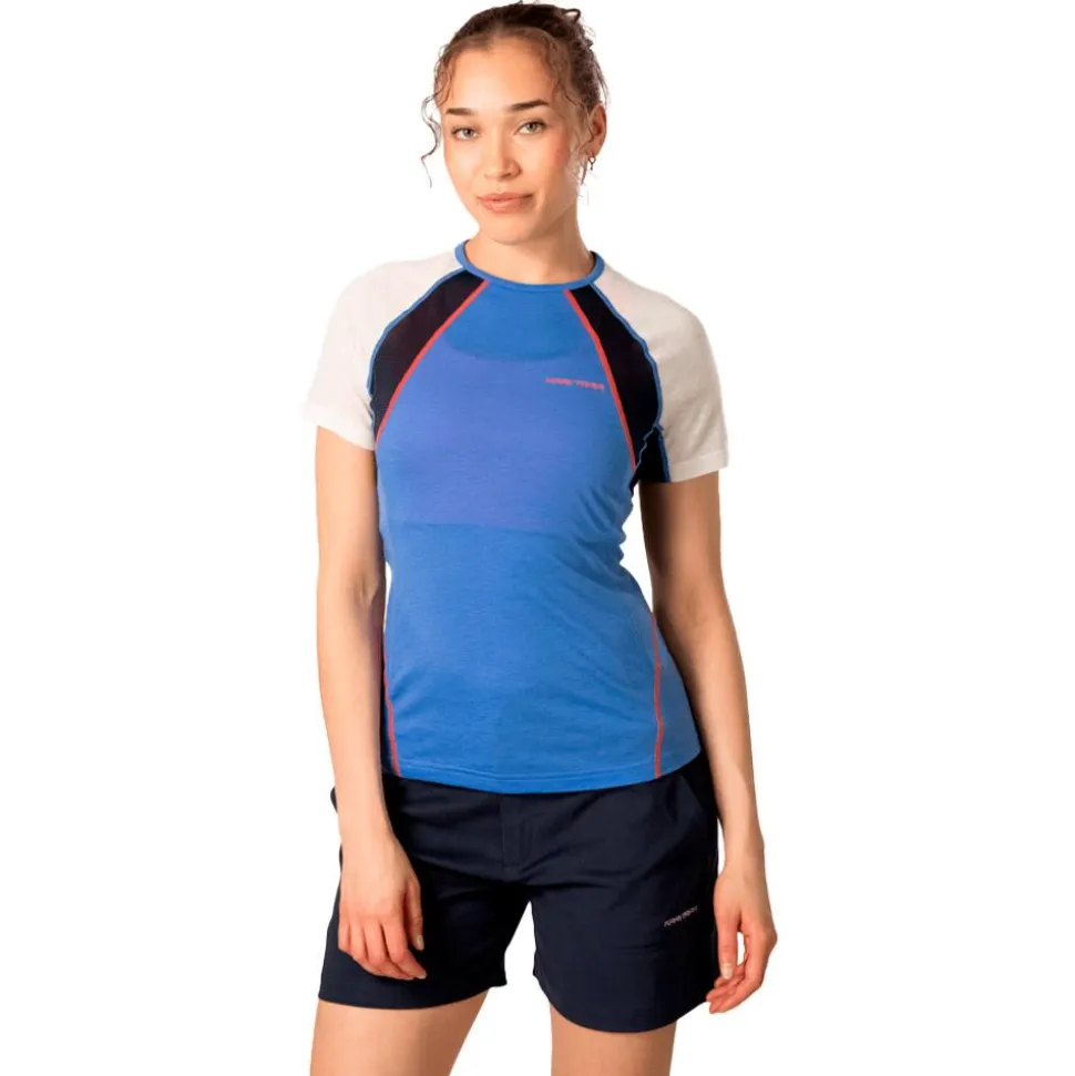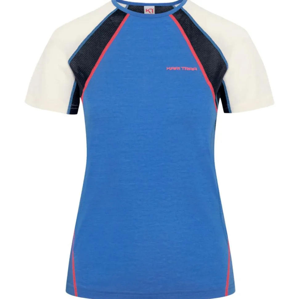 Le Kari Traa Alma Tee Shirt Sea est un t-shirt de trail respirant et confortable pour femme, assurant une liberté de mouvement et un séchage rapide grâce à sa composition en polyester, laine et Lyocell Tencel.