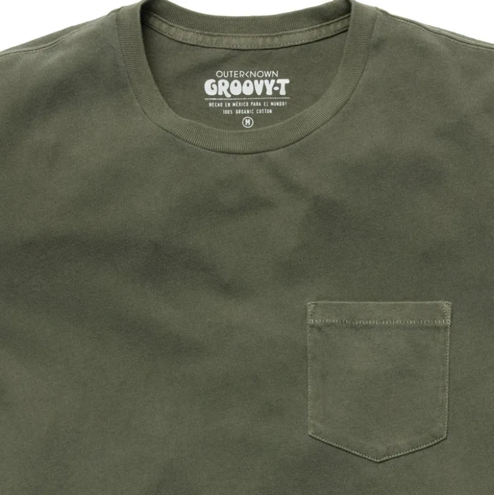 Le Groovy Pocket Tee Safari d’Outerknown, avec sa coupe décontractée et sa poche poitrine, est un essentiel délavé en coton bio.